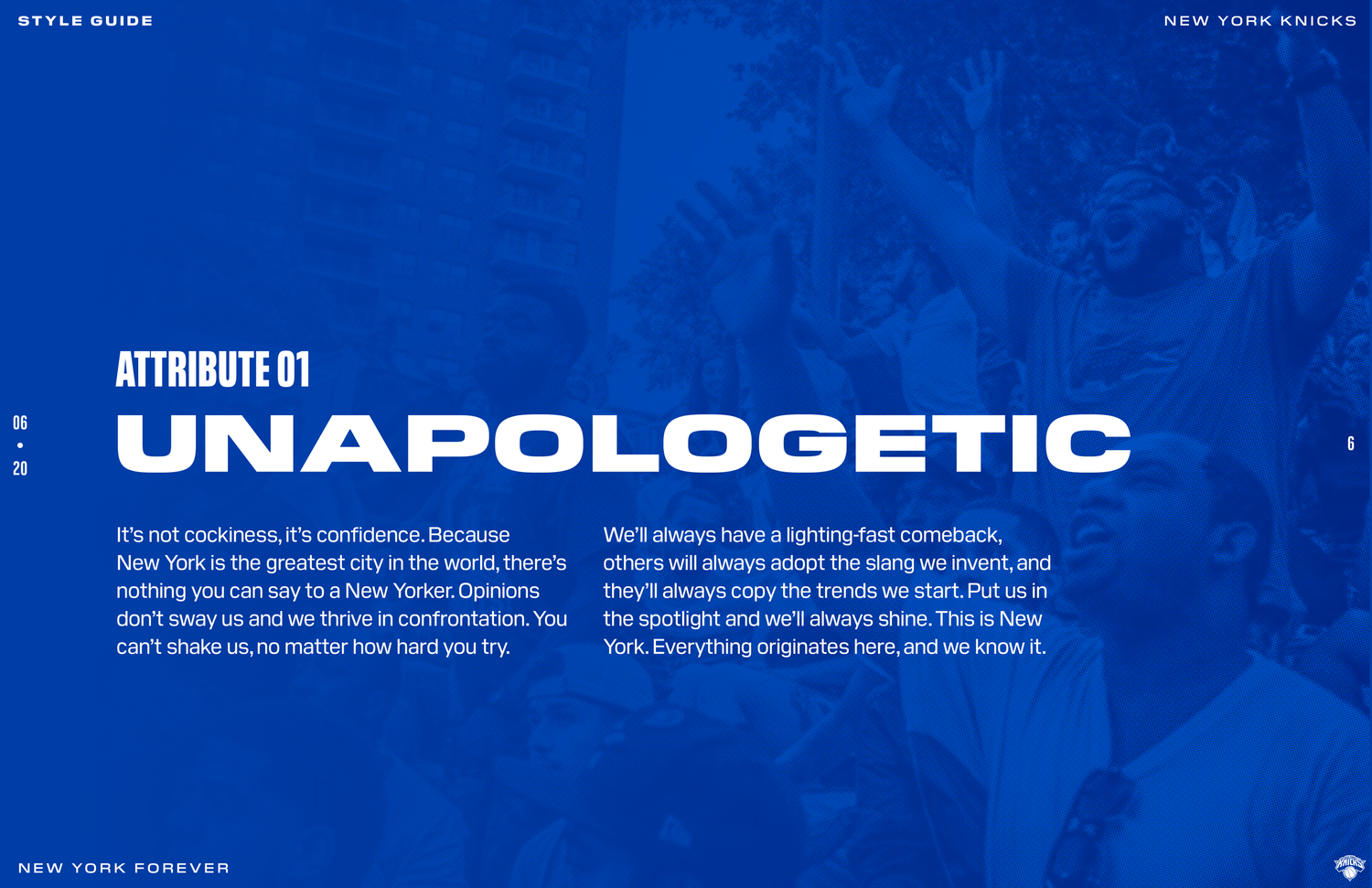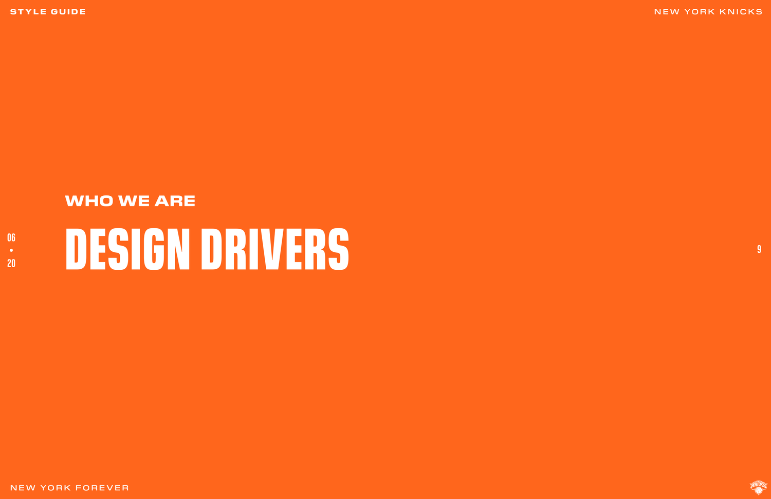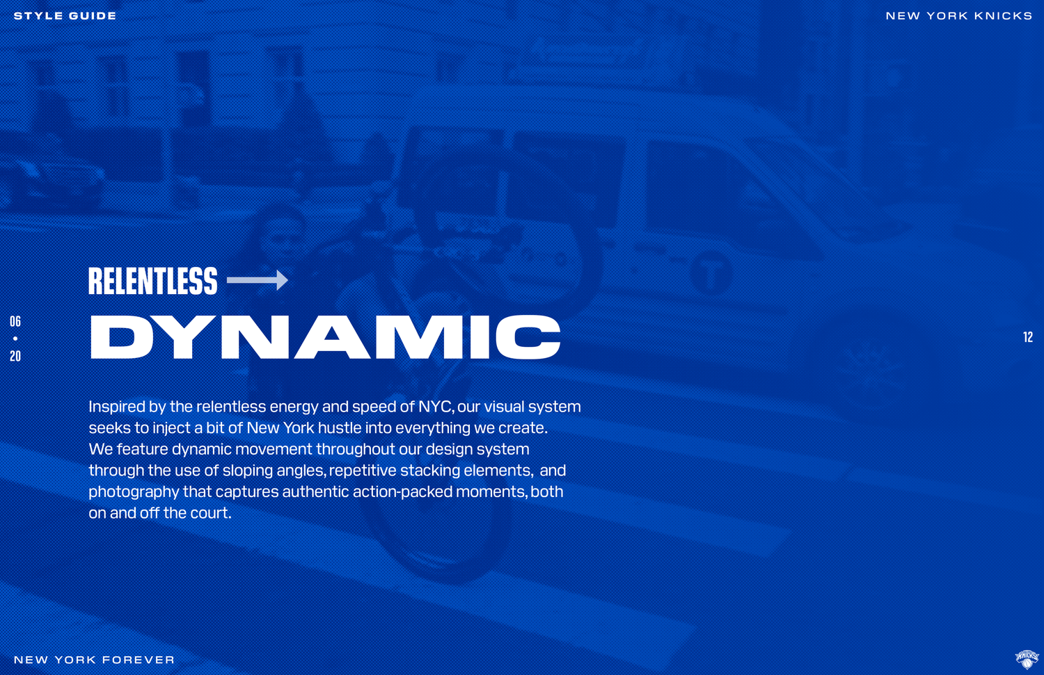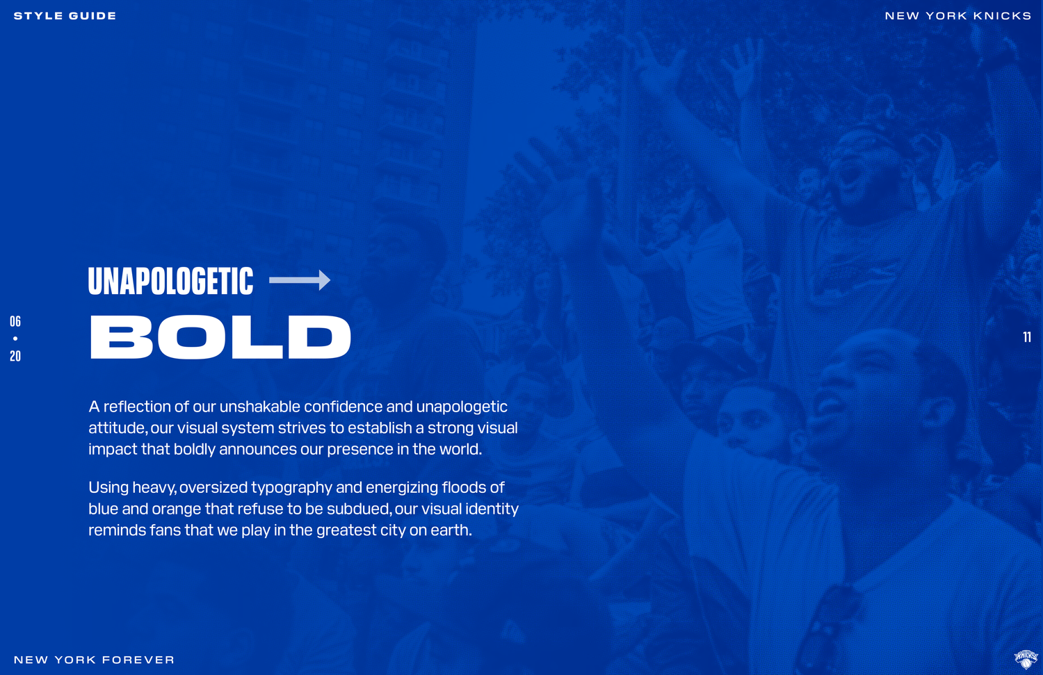 The New York Knicks 2020 brand system was designed to connect with Gen Z fans while honoring the legacy and persona of New York. The objective was to establish a refreshed identity across social and OOH by building a cohesive design language rooted in heritage and culture. Following an in-depth brand audit, the team produced a 74-page brand book detailing graphic rules, typographic hierarchy, photography treatment, and a modern interpretation of core brand elements.