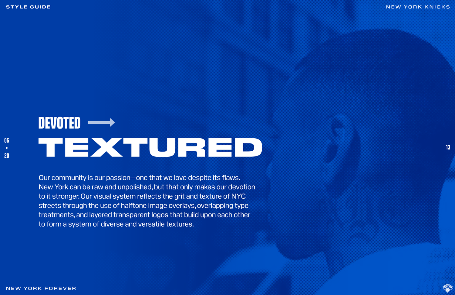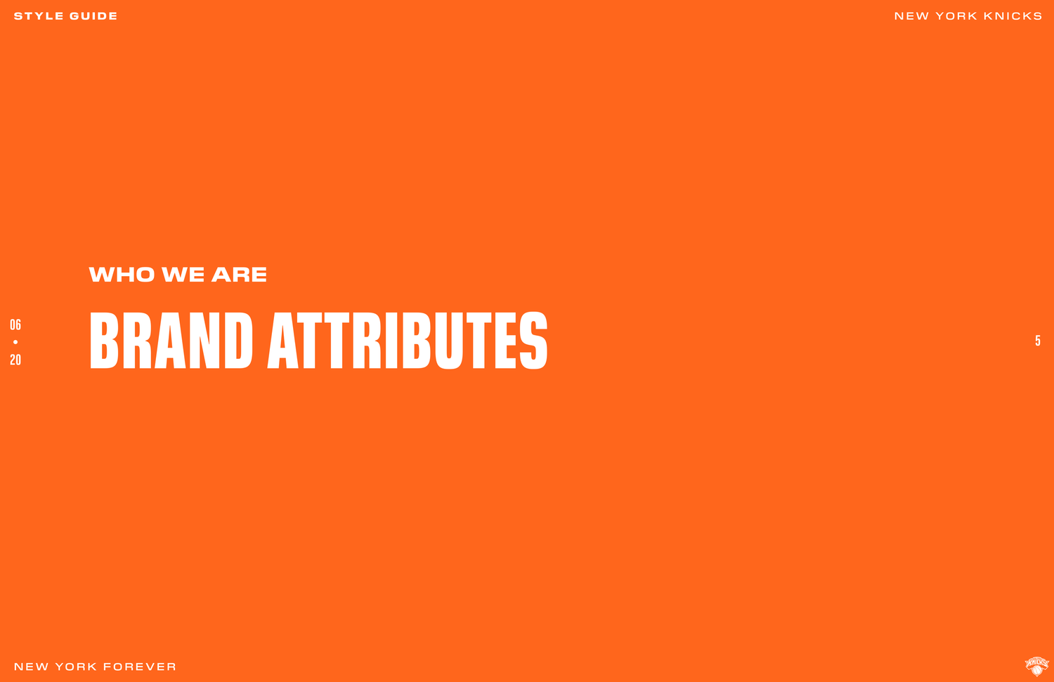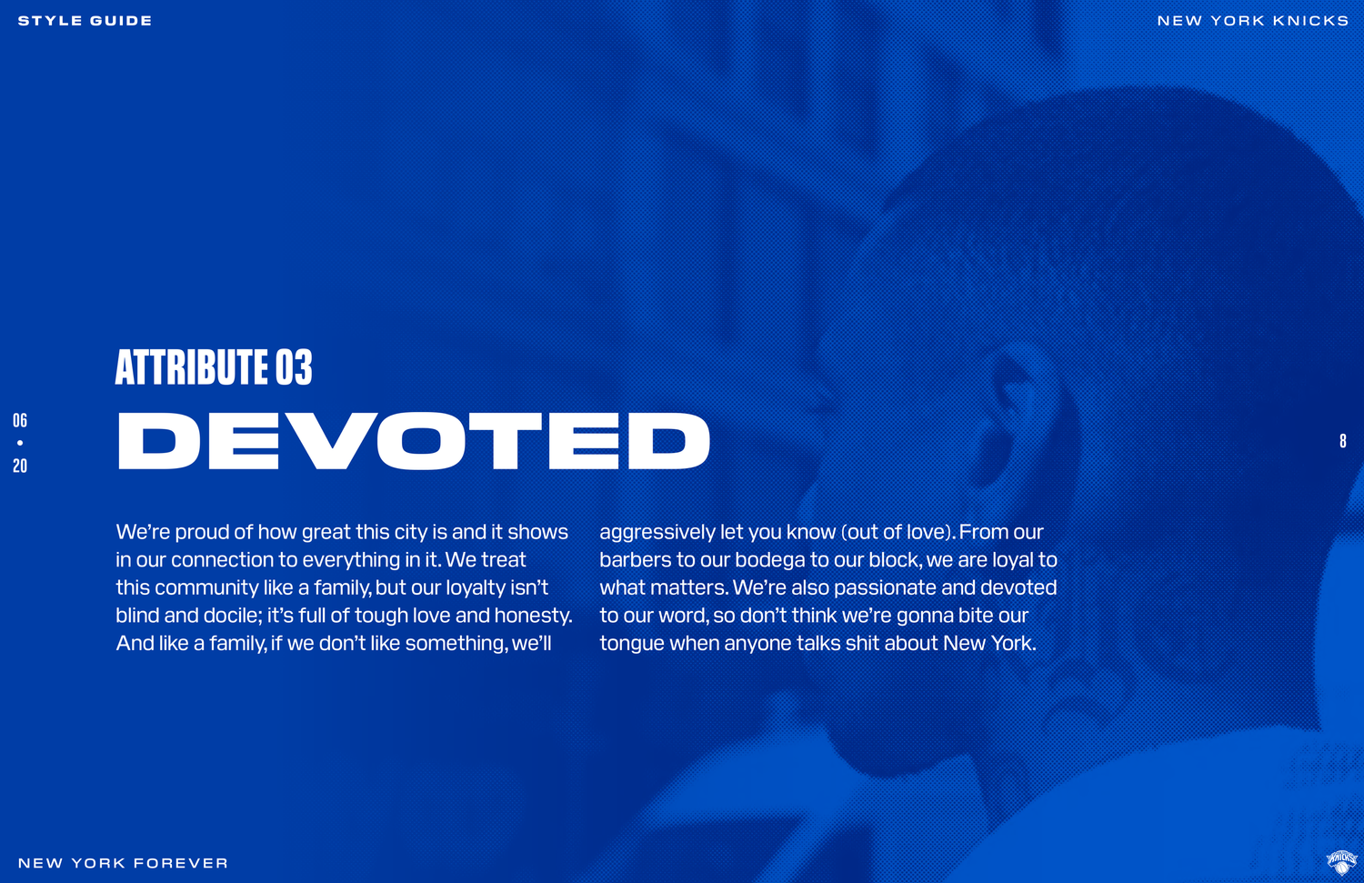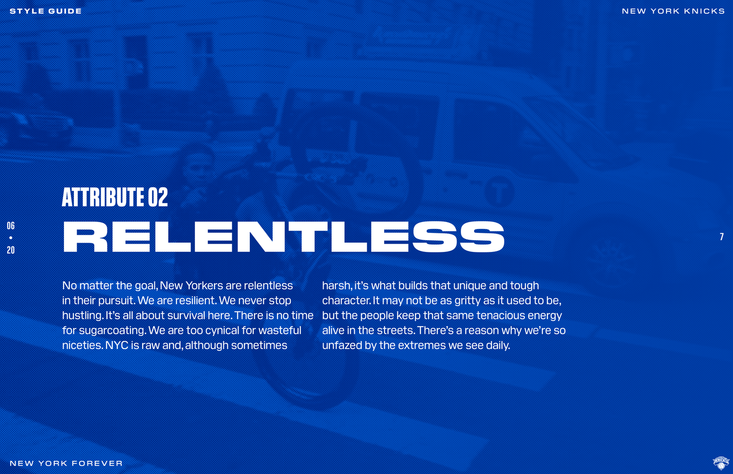 The New York Knicks 2020 brand system was designed to connect with Gen Z fans while honoring the legacy and persona of New York. The objective was to establish a refreshed identity across social and OOH by building a cohesive design language rooted in heritage and culture. Following an in-depth brand audit, the team produced a 74-page brand book detailing graphic rules, typographic hierarchy, photography treatment, and a modern interpretation of core brand elements.